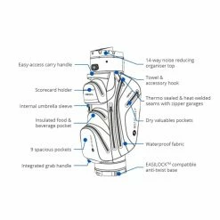Waterproof and lightweight, the PROTEKTA includes a noise reducing 14-way organiser top to hold the clubs securely in place, plus a wide-range of other features to keep you organised out on the course.