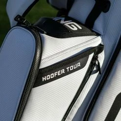 The new Ping Hoofer Tour stand Bag is Inspired by the popular Tour Staff bag, the Hoofer Tour carry bag is organised and affords generous storage space. A new back puck allows the dual padded straps to convert easily to a single, and the large apparel pocket has a full-length zipper for easier access. A magnetic quick-access pocket and two zippered, expandable water-bottle pockets are among 9 pockets altogether. With a roomy 5-way top.