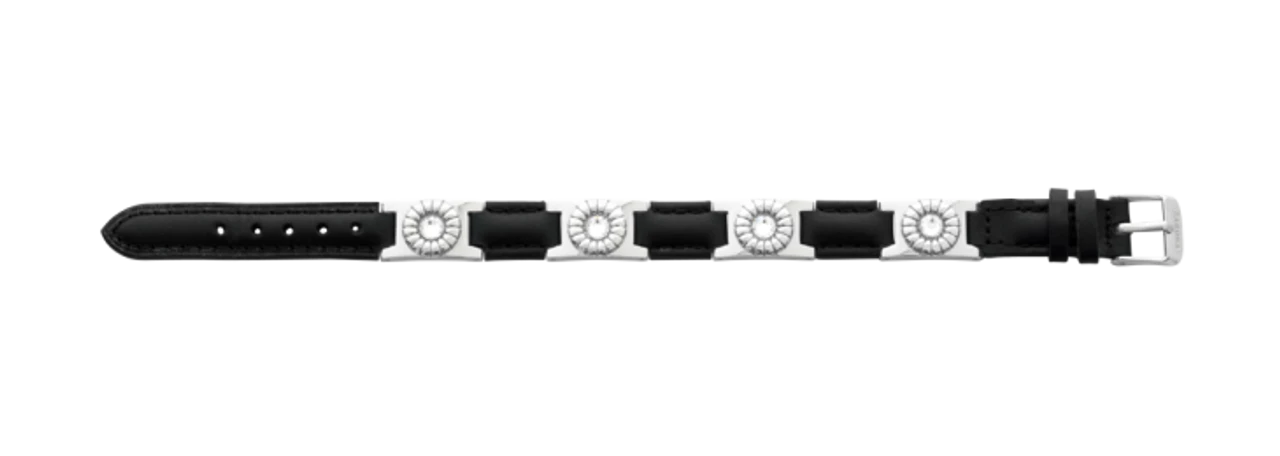 The stitching on the black leather provides style as well as strength. Elegant cubic zirconia gemstones add sparkle for the ladies’ bracelets.