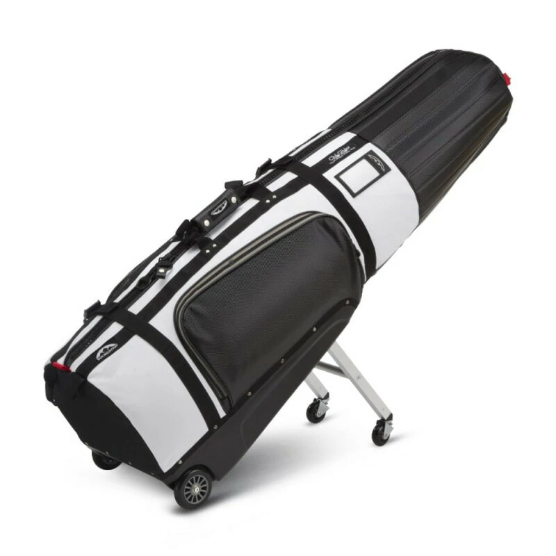 Sun Mountain Club Glider Tour travel bag is made from durable vinyl fabric that keeps your clubs and equipment protected during travel. Integrated leg supports which retract when not in use ensures your not bending down to pick up your bag during use. Pivoting caster wheels enables superb manoeuvrability and internal straps to keep your bag in place. Slightly larger than the Journey this bag easily fits a large cart bag and features 2 external pockets for all your golfing equipment.
